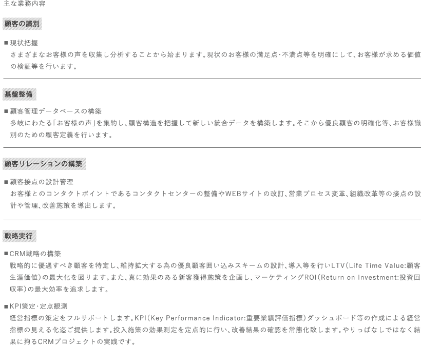 私たちは「お客様の声」を起点として、お客様と企業がともに理解・共感・価値共創を実現するためのCRM戦略「顧客起点のマーケティング・マネジメントシステム」を構築し、安定的な事業成長をご支援させていただきます。 |
