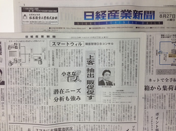 2013年8月27日の日経産業新聞(7面)に弊社の紹介記事が掲載されました。 「小さな巨人」スマートウィル(顧客管理DBコンサル) 「上客」抽出 販促促す 潜在ニーズ分析も強み といった見出しで、顧客データベースの構築や見直し、顧客との関係強化といったコンサルティングサービスを提供している会社として、紹介頂いています。 (一部抜粋) スマートウィル(東京・港)は、企業の顧客情報管理(CRM)システムの活用を軸に経営を支援するコンサルティング会社だ。ソーシャルメディアの広がりで、顧客獲得につながる情報は世の中にあふれている。しかし、坂本雅志社長は「情報を集めるだけでなく、顧客づくりに生かす使い方が大事」とあえて指摘する。「ビッグデータ解析」を単なる顧客分析に終わらせず、業績につながる活用法を指南するのが同社の持ち味だ。